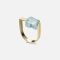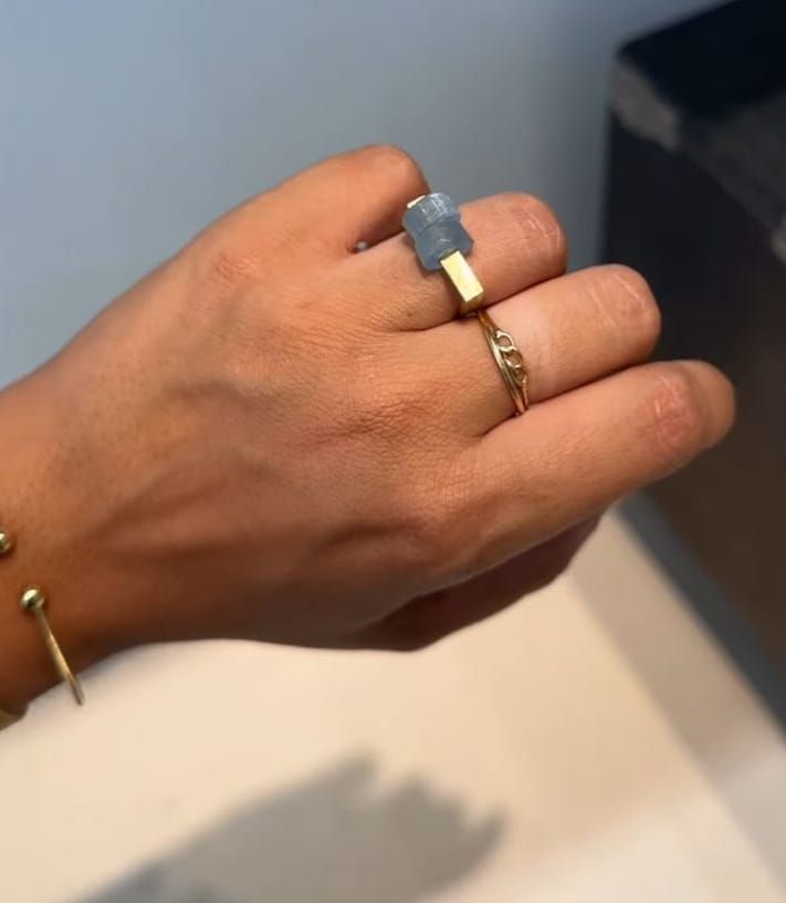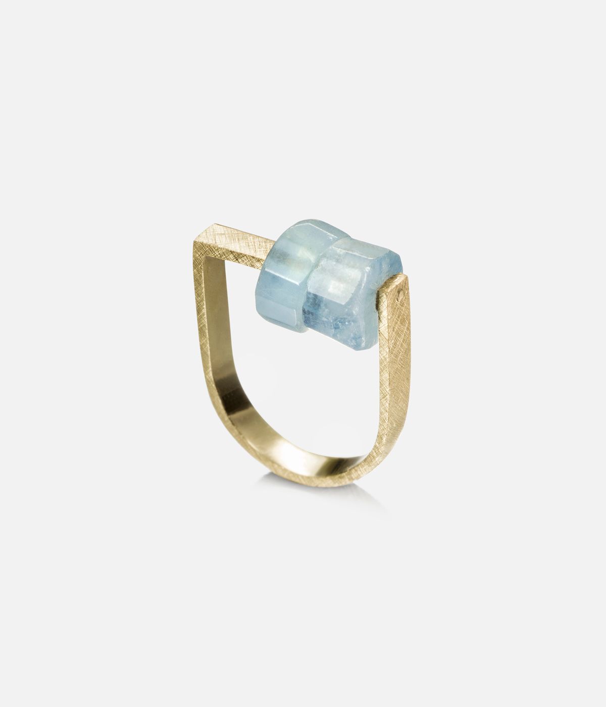 Diseñado por Luna Alba y hecho a mano en nuestro taller, el anillo Horitzó combina oro de 18 quilates con dos aguamarinas en bruto que capturan la luz con naturalidad.