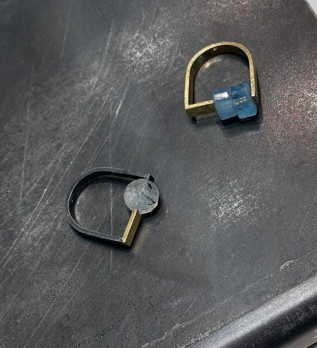 Su forma —semicircular, con bordes rectos y una piedra que flota entre planos— refleja la unión entre lo técnico y lo intuitivo, entre la estructura y el movimiento.