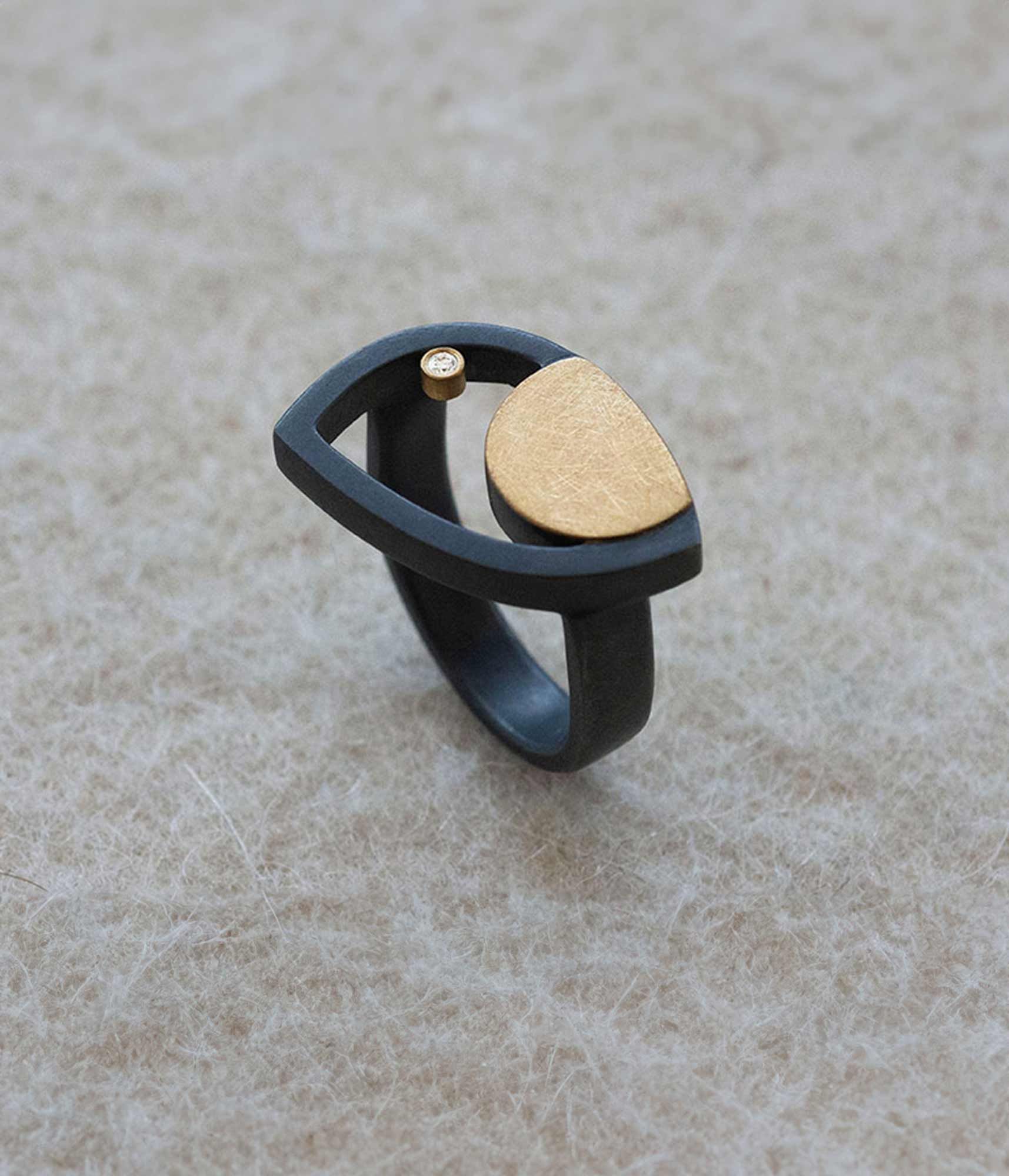 El Anillo Blatt Aura de Joan Datzira está realizado en plata oxidada, con una aplicación de oro de 18 quilates y un diamante talla brillante de 0,02 ct (G VS) engastado en un chatón cilíndrico tambie´n de oro de 18 quilates.