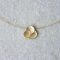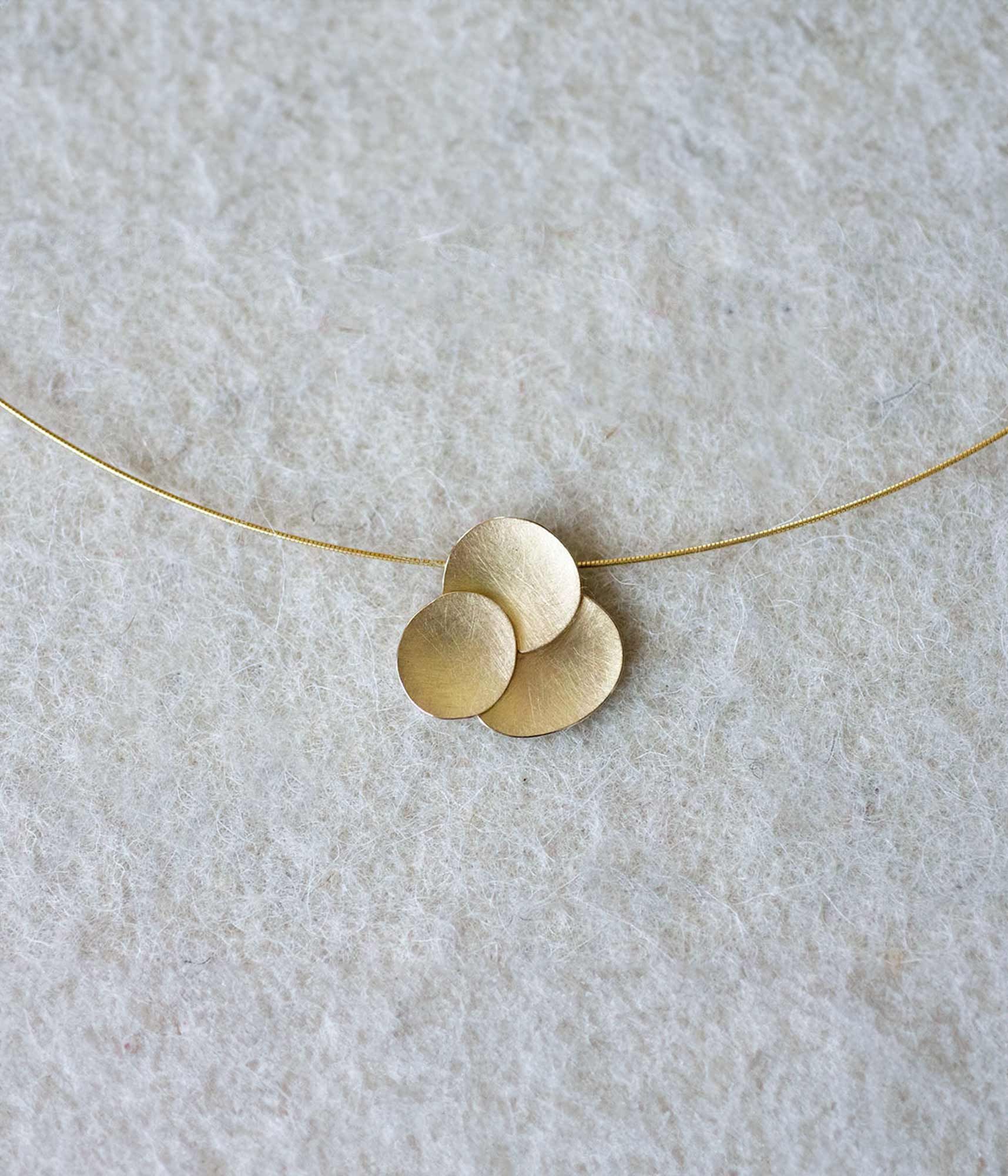 El colgante está formado por tres discos de oro de 18 quilates, ligeramente ovalados y con acabado satinado, que se superponen generando un juego de volúmenes y reflejos suaves, casi celestes. Cada disco está trabajado de forma artesanal, dejando visible la textura del metal y su carácter orgánico.