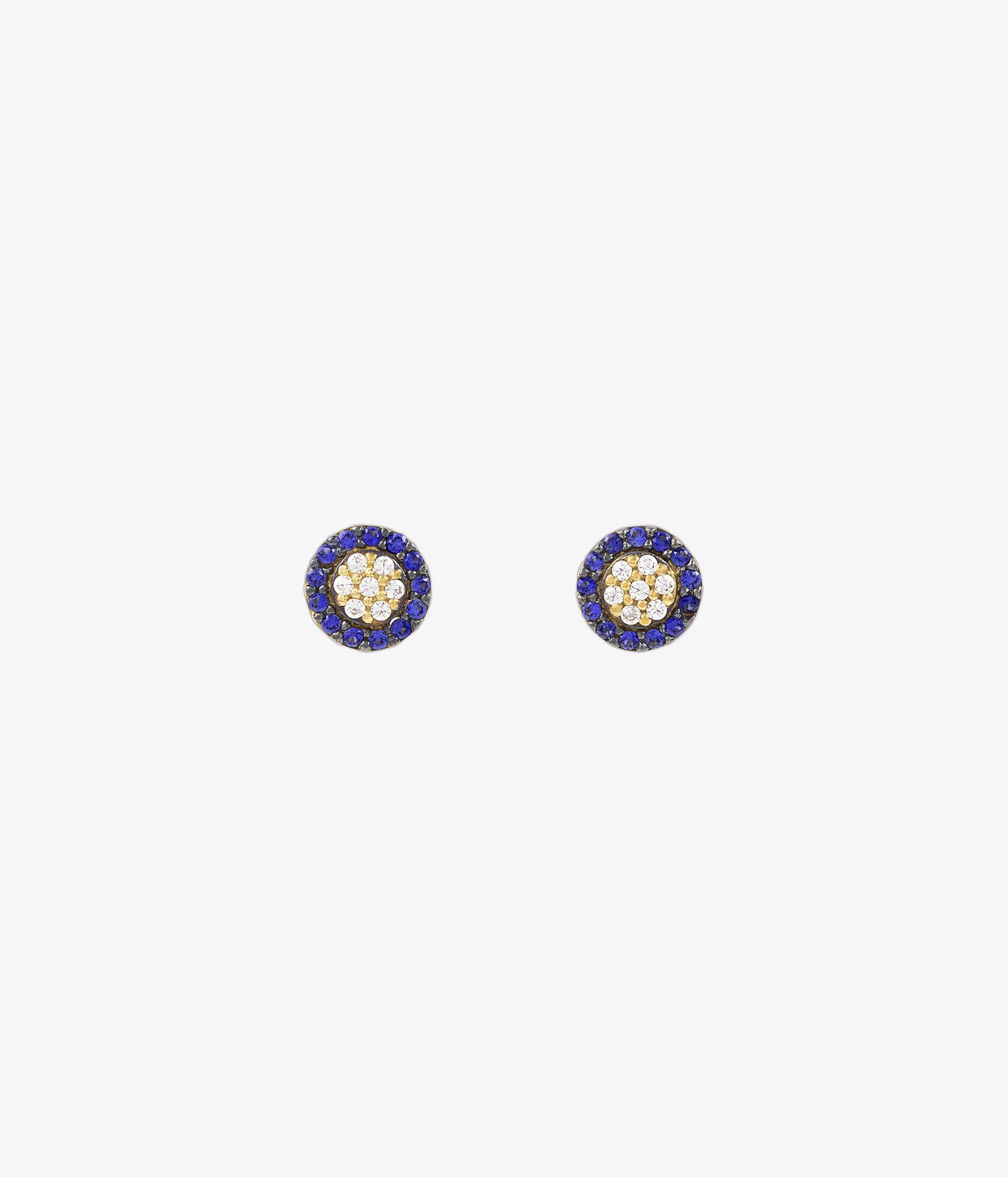 Pendientes en oro amarillo 18K con pavé central de cuarzos blancos y halo de zafiros naturales, un diseño circular elevado que multiplica la luz y crea un destello azul y blanco lleno de elegancia contemporánea.