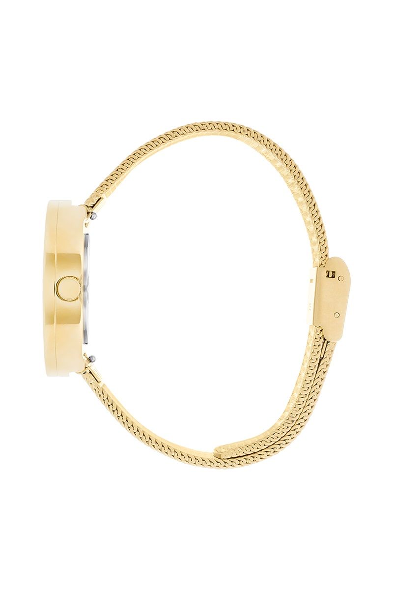 La malla de acero dorada ofrece un ajuste flexible, ligero y cómodo, además de reforzar la estética refinada del conjunto. El tamaño de 34 mm favorece una presencia proporcionada y especialmente versátil.