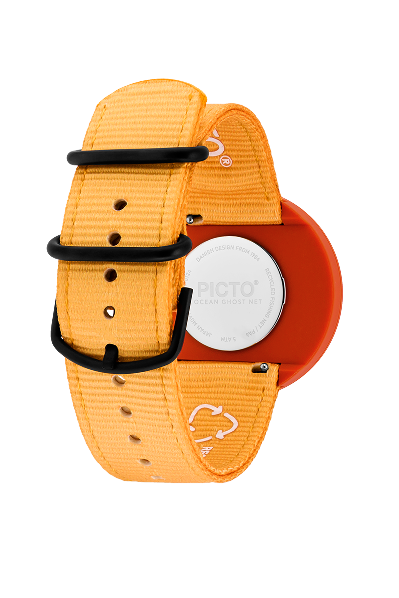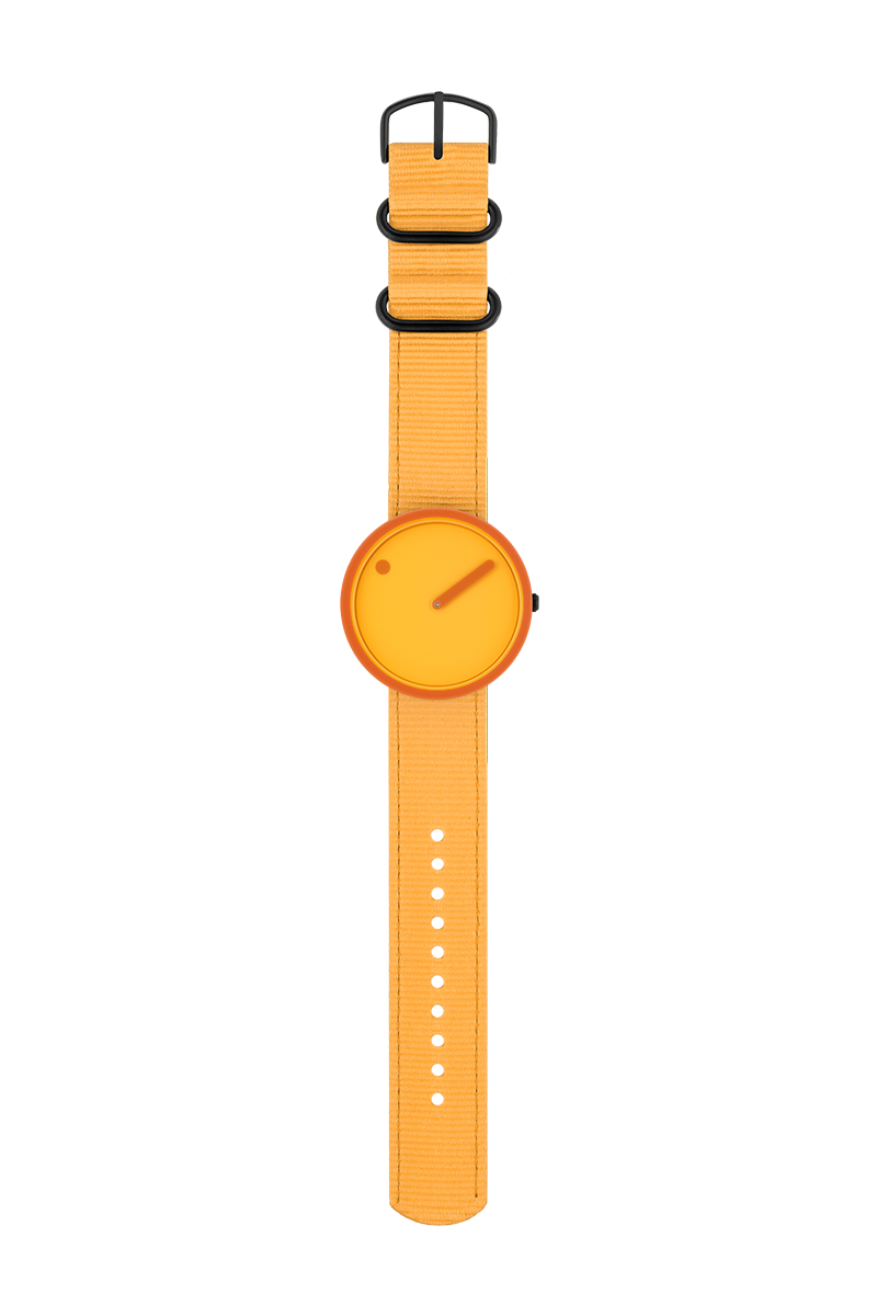 El PICTO 40 mm amarillo tostado es una reinterpretación actual de uno de los relojes más icónicos del diseño escandinavo. Su esfera giratoria, su acabado en amarillo tostado y su correa reciclada a juego crean una pieza visualmente cálida, contemporánea y con una identidad muy definida.